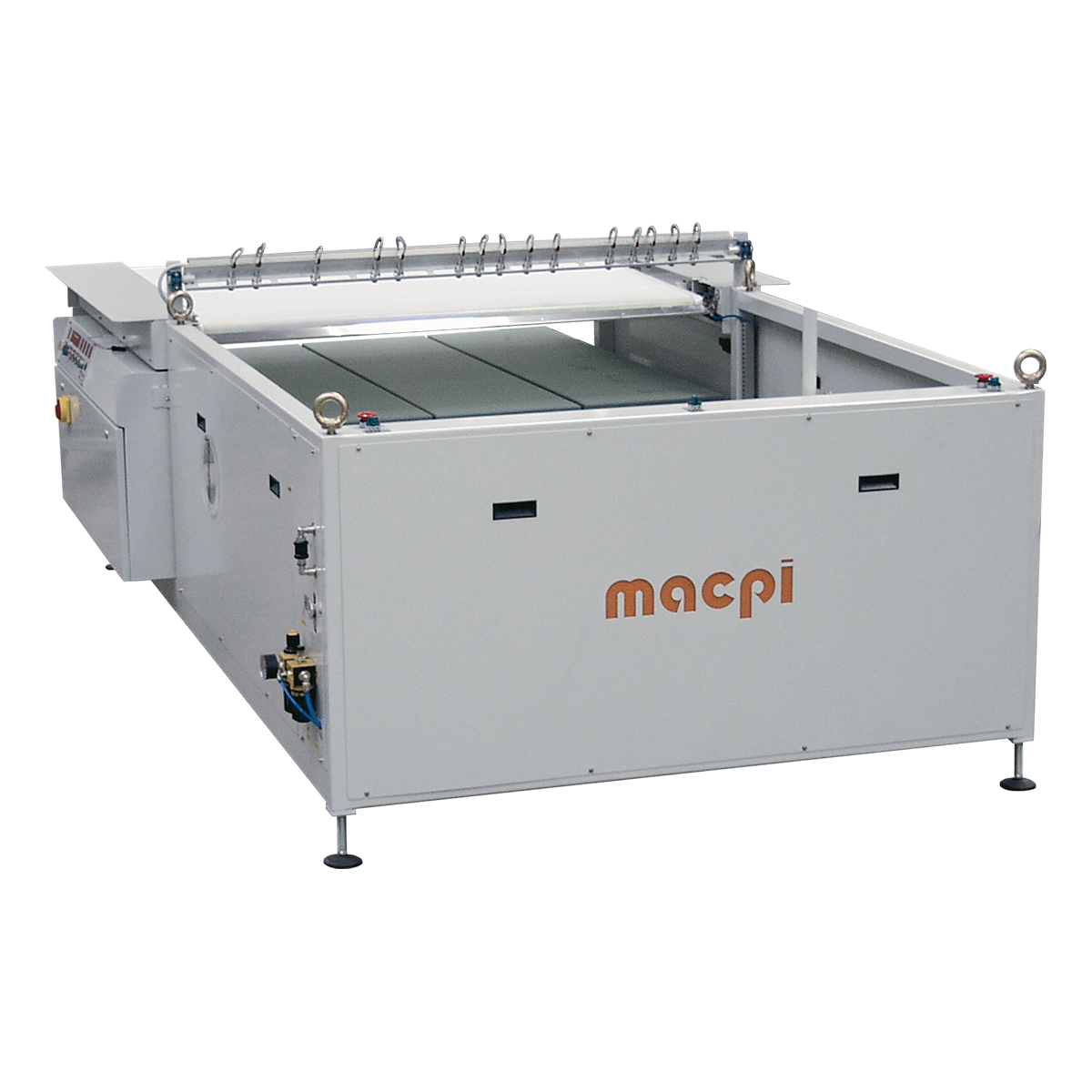 * lama con soplado de aire para el paso de las piezas de la cinta al descargador