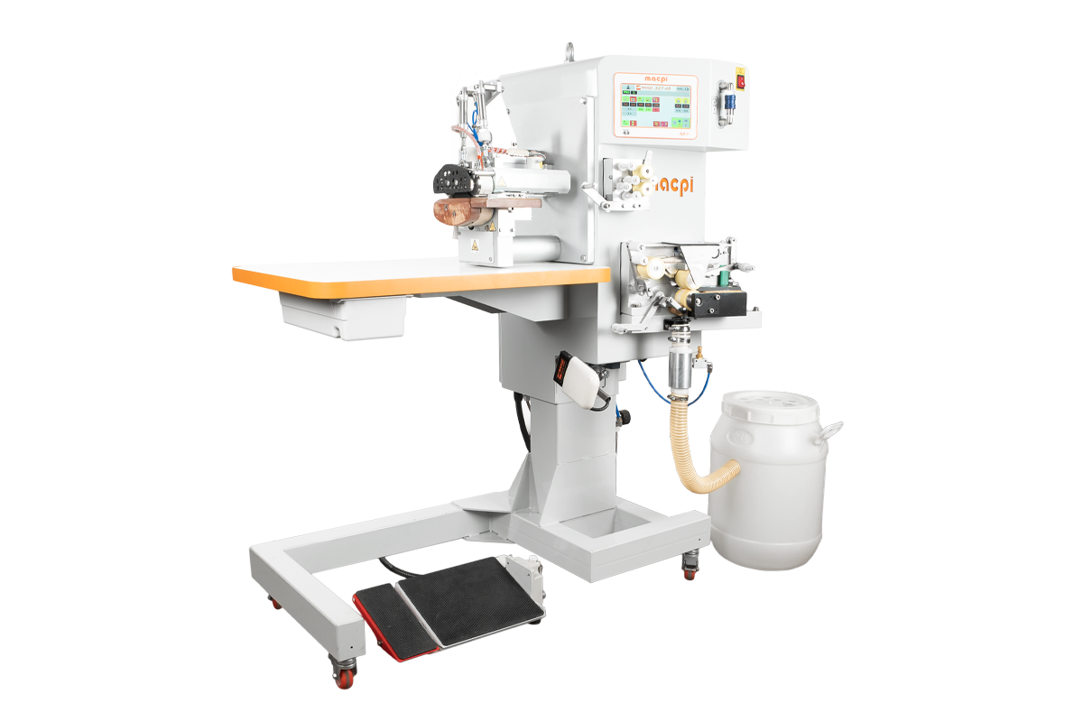 Máquina para ribetear una tela pre-adhesivada en el dobladillo, plana o con forma.