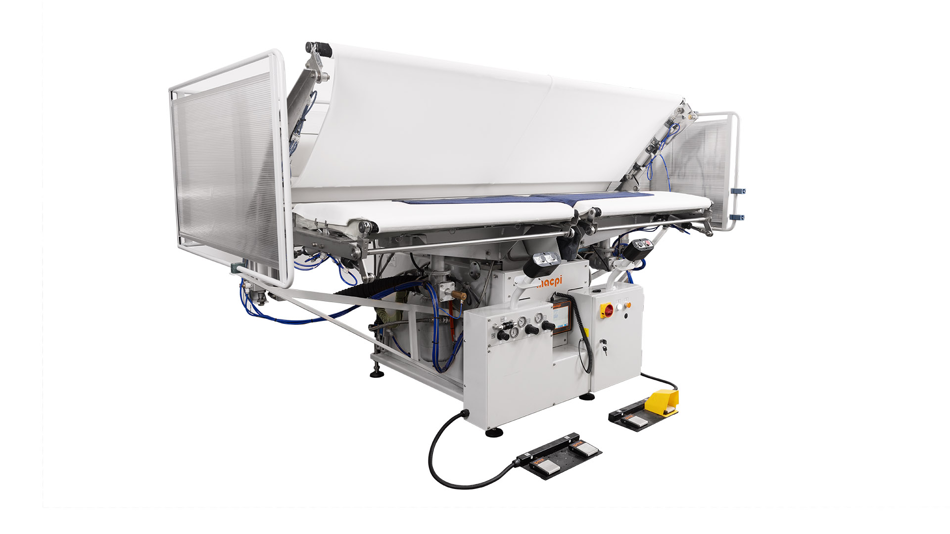 Máquina de planchar electroneumática con formas calentadas a vapor, plato superior móvil retráctil montado sobre brazo activado por pulsadores y plato inferior móvil con subida vertical.